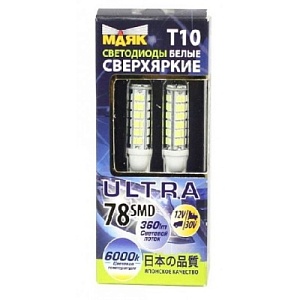 Светодиод 12-30V T10 78SMD (3014) W2,1x9,5D WHITE 360° 6000К (2шт.) В-03