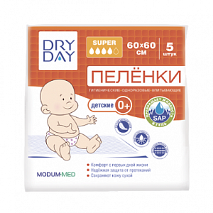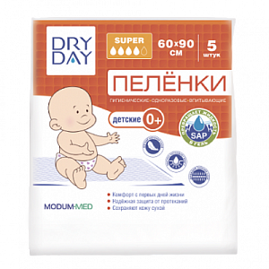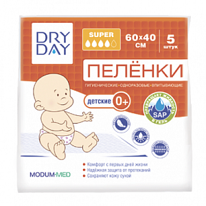 Пелёнки гигиенические DRY DAY одноразовые впитывающие детские 0+ super 60х40 5шт (60)