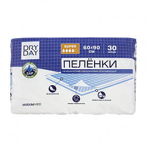 Пелёнки гигиенические DRY DAY одноразовые впитывающие super 60х90 30шт (3)